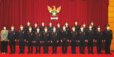 消防局领导层以及各部门主管与新晋升消防官合照。