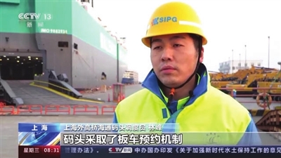 上海外高桥海通码头调度员 林峰:针对出口量的提升,码头采取了板车预约机制,跟客户确认运输计划,提早预留场地,提升了进港效率。