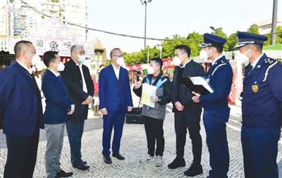本报讯(记者 桂英)农历新年期间,本澳节庆盛事连连,为确保市民游客能欢度佳节,防范各类贺岁活动潜在的安全隐患和治安风险,警察总局局长助理梁文照联同海关助理关长李煜辉、旅游局助理关长许耀明讯、治安警察局副局长梁庆康、消防局副局长邝逸富、司法警察局代副局长苏兆强、交通事务局、市政署和文化局等多名领导及主管人员,于1月18日前往妈阁庙、花车巡游沿线、塔石广场年宵摊位等地进行实地巡视,并听取警务单位及相关部门新春期间的警务部署,包括﹕人流管控、交通疏导、以及防火救援等各方面的安排,亦了解烟花汇演期间,海上临时航道和救援措施的安排等。