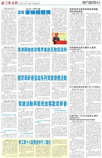 教育及青年发展局持续与卫生部门沟通,根据疫情动态研判和调整学校预防措施,经听取意见,教青局宣布,非高等教育方面:春节假期后,原定同一天每班新增4人阳性则该班停课的措施将会停止;为了解假期后师生的健康状况,所有师生须于1月28日至29日内完成一次抗原快测并上载结果至快速抗原结果申报平台(澳门健康码内可直接进入连结)。