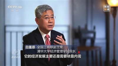全国工商联副主席、清华大学经济管理学院院长 白重恩:“任何一个大的经济体的经济发展主要还是需要依靠内需,内需包括消费和投资,居民消费未来继续增长是我们一个重要的发展方向。只有有了投资,我们才能有不断的创新,才能有不断的产业升级,为未来的发展打下良好的基础。”