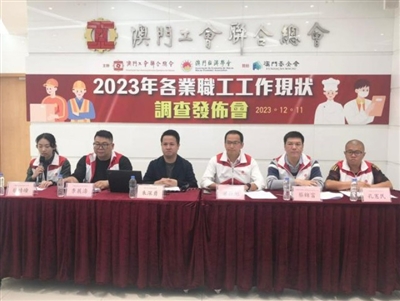 工联11日上午11时假工联大厦地下大堂举行新闻发布会,介绍相关调查结果,由工联副理事长梁孙旭,工联副理事长兼权益委员会主任蔡锦富,工联权益委员会副主任孔宪民,工联政策研究室主任研究员李展涛、助理研究员蔡靖瞳,及澳门经济学会理事朱深勇主持。