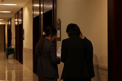 企业谈判代表在场外商量。新华社记者 彭韵佳 摄