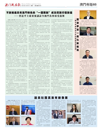 “习主席的重要讲话,体现国家对澳门特区完善治理体系和提升治理能力的肯定与期许。”澳门城市大学副校长叶桂平说,未来澳门特区政府应当坚持主动推进完善与宪法和基本法实施相关的制度,将维护中央全面管治权和规范中央授予特区的高度自治权更好地结合起来,全面落实“爱国者治澳”原则,切实保障特区的繁荣稳定。