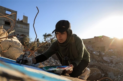1月5日,在加沙地带南部城市拉法,巴勒斯坦画家阿迈勒·阿布·萨巴赫在废墟上绘画。新华社发(里泽克·阿卜杜勒贾瓦德摄)