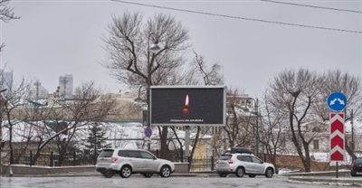 3月23日,俄罗斯远东城市符拉迪沃斯托克街头的广告牌播出蜡烛图案,悼念莫斯科近郊恐袭事件遇难者。 新华社发 郭飞洲 摄