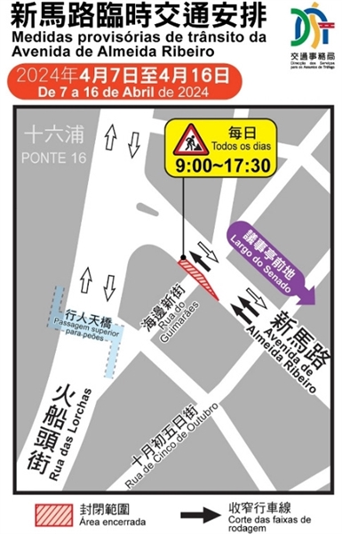 本报讯(记者 大林)「内港南雨水泵站及下水道工程」将于新马路近海边新街一段进行地下施工,期间需占用新马路往十六浦方向部份车道,为配合工程,新马路往火船头街方向7日起至16日每天上午9时至下午5时30分,将在警方协助下实施有限度通车,并按实时情况调整交通灯配时。工程期间巴士服务不受影响。