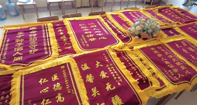 这是2024年3月26日拍摄于江西省肿瘤医院的安宁疗护病区,医生们收到患者家属的部分锦旗。新华每日电讯记者 胡晨欢摄