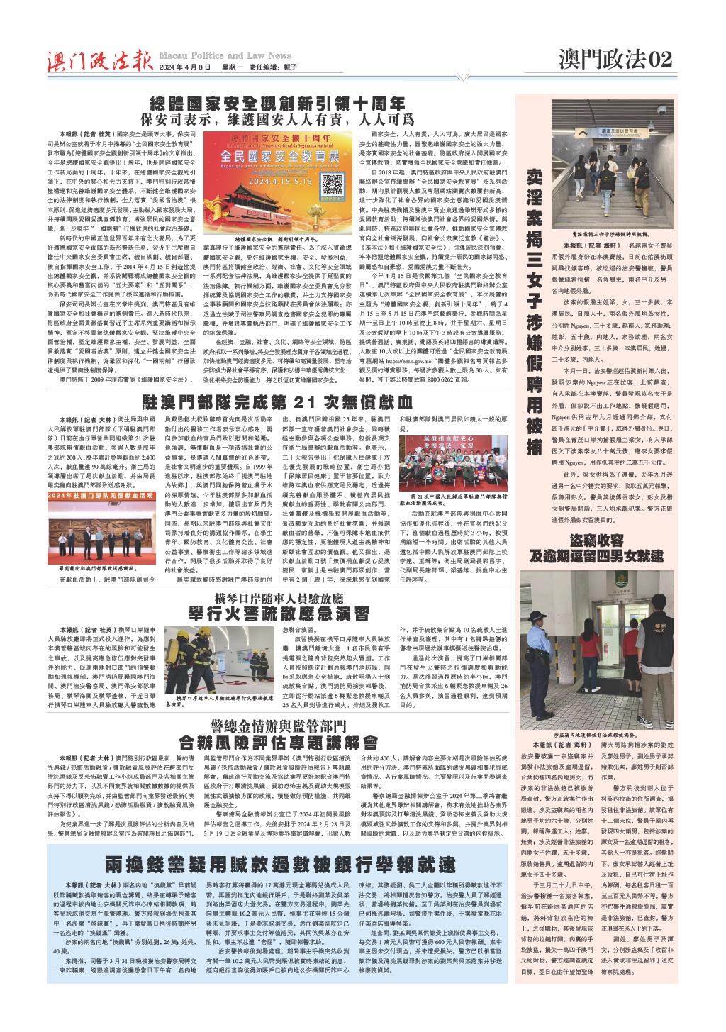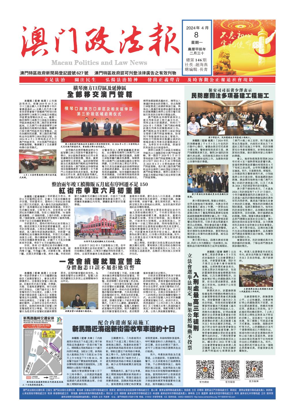01 一版要聞 02 澳門政法 03 澳門專題 04 澳門新聞 05 神州聚焦 06 國際熱點 07 生活与法 08 深度觀察