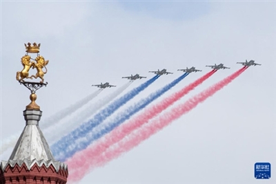 5月9日,在俄罗斯首都莫斯科,苏-25攻击机编队在红场上空飞过。新华社记者 白雪骐 摄