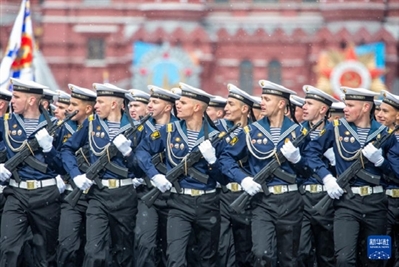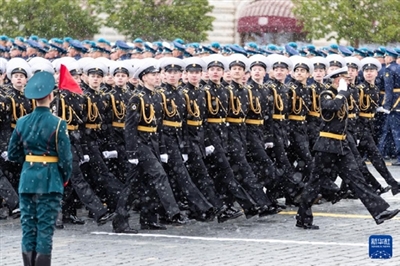 5月9日,在俄罗斯首都莫斯科,士兵列队走过红场。新华社记者 白雪骐 摄