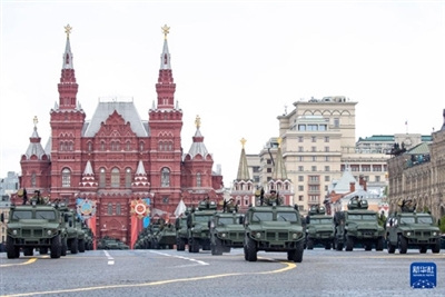5月9日,在俄罗斯首都莫斯科,军车编队驶过红场。新华社记者 曹阳 摄
