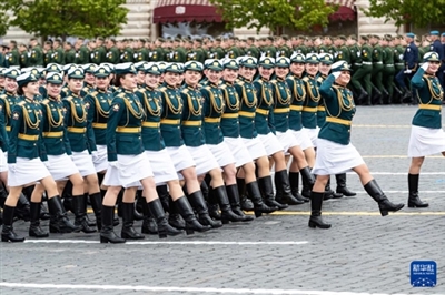 5月9日,在俄罗斯首都莫斯科,女兵列队走过红场。新华社记者 白雪骐 摄