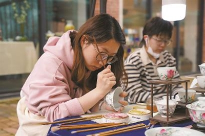 陶溪川市集的绿伞传统区,一位创作者在瓷器上作画。 王倩 摄