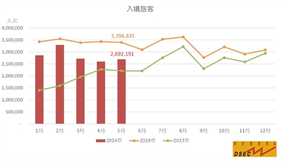 而2024年首五个月的入境旅客共14,168,665人次,按年上升50.2%,恢复至2019年同期的82.4%。