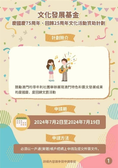 本报讯(记者 大林)为庆祝中华人民共和国成立75周年、澳门回归祖国25周年,文化发展基金推出「庆国庆75周年、回归25周年文化活动资助计划」,鼓励澳门依法成立的非牟利社团举办展现澳门特色和艺文发展成果的庆国庆、贺回归的文艺活动,提升全澳门的喜庆氛围,进一步推动社会广泛参与,同贺双庆盛事。