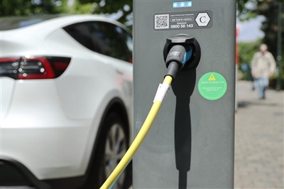6月6日,在比利时布鲁塞尔,一辆电动汽车在欧盟委员会附近一充电站充电(资料照片)。新华社记者赵丁喆摄
