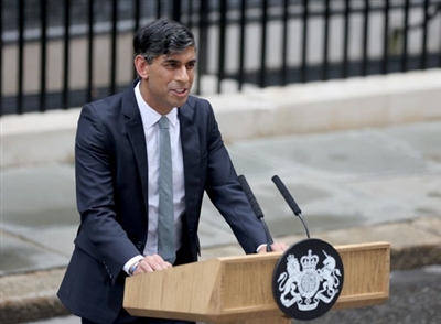 7月5日,苏纳克在英国伦敦唐宁街10号首相府前对媒体发表讲话。新华社记者李颖摄