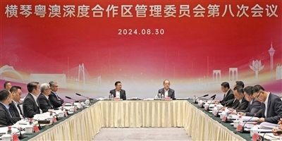 本报讯 (记者 大林)横琴粤澳深度合作区管理委员会第八次会议8月30日在横琴举行。会议由深合区管理委员会双主任,澳门特别行政区行政长官贺一诚和广东省省长王伟中共同主持。