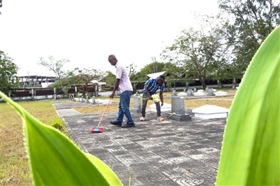 8月12日,姆萨菲里·奥马里(右)和同事在援坦中国专家公墓打扫。