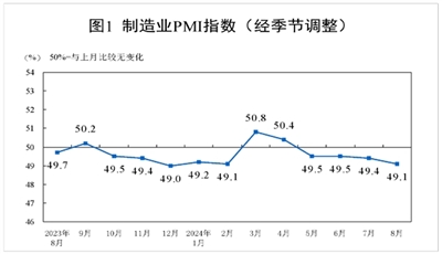 8月份,制造业采购经理指数(PMI)为49.1%,比上月下降0.3个百分点,制造业景气度小幅回落。