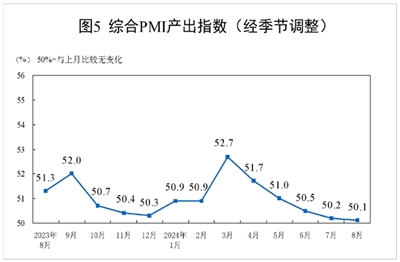 8月份,综合PMI产出指数为50.1%,比上月下降0.1个百分点,继续位于扩张区间,表明我国企业生产经营活动总体保持小幅扩张。
