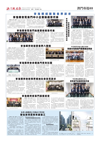 本报讯(记者 桂英)9月17日下午四时,第六任行政长官参选人岑浩辉在代理人李焕江、竞选办公室副主任陈家良等陪同下,于侨安大厦拜会澳门归侨总会,举行座谈并听取意见。