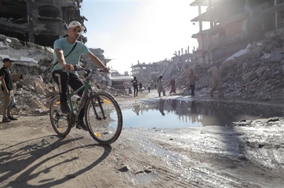9月9日,一名男子在加沙地带北部杰巴利耶难民营骑行。新华社发(阿卜杜勒拉赫曼·萨拉马摄)