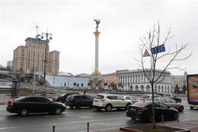 2022年2月24日,车辆从乌克兰基辅独立广场旁驶过。新华社记者李东旭摄