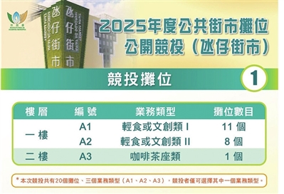 本报讯(记者 大林)凼仔街市20个轻食文创及咖啡茶座摊位正进行公开竞投,截止投标日期为本月23日,有意投标者须于当日下午1时正前递交申请表、竞投计划书及临时保证金等。