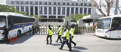 4月3日,在韩国首尔,警察在韩国宪法法院前执勤。新华社记者 姚琪琳 摄