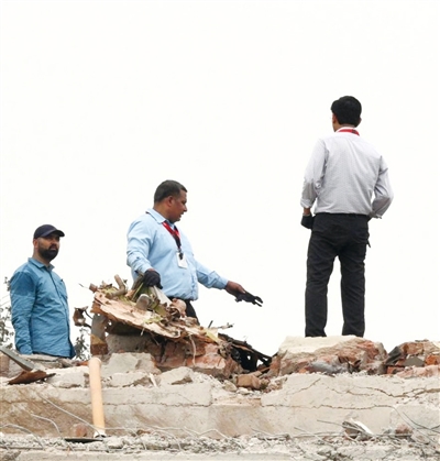 6月13日,工作人员在印度古吉拉特邦艾哈迈达巴德的坠机现场调查。新华社发(印亚新闻社供图)