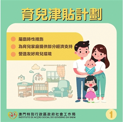 为鼓励生育并协助育养婴幼儿的家庭减轻部分经济负担,澳门特区政府推出临时性的《育儿津贴计划》,对象为2025年至2027年期间出生且持有效澳门特区永久性居民身份证的婴幼儿,津贴金额为每年度18,000澳门元。经特别考虑2025年前出生、且于法规生效时仍未满3周岁或刚满3周岁的幼儿的养育需要,在2022年至2024年期间出生的幼儿亦列为津贴受惠对象,将按具体情况获发一个年度至三个年度的津贴。
