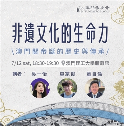 是次举办的“非遗文化的生命力:澳门关帝诞的历史与传承”书展讲座邀来该书的三位作者吴一怡、容家俊、董自伦亲临现场,介绍澳门关帝信仰的历史渊源、关帝诞的庆祝群体及其活动,以探讨关帝诞在澳门的传承与发展,展现非物质文化遗产历久弥新的独特魅力。讲座将于7月12日(日)下午6时30分至7时30分于澳门理工大学书展讲座区举行,名额有限,先到先得,欢迎市民踊跃参与,如有查询,可电邮至da_info@fm.org.mo。