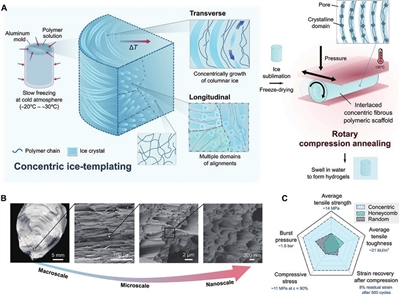 自然界中,如椎间盘、血管、鱼鳔等生物组织因具有环向纤维状结构而具备优越的力学性能。传统冰模板法通过控制冰的定向生长来制造仿生结构的水凝胶,只能制造有限结构,且成本高昂、效率低下,严重限制了仿生水凝胶在性能上与自然材料的匹配。研究团队发现,通过慢速冷冻能诱导冰晶平行于冷源生长,据此研发出“同心冰模板法”,首次成功构建新的环向纤维结构。此外,团队亦改良现有退火工艺,开发出旋转压缩退火方法,令水凝胶在保持85 wt.%含水量的情况下,具备高强度、高韧性、抗疲劳性能、可压缩性、高爆破压等多重机械性能,使材料微观结构更加致密,进一步提升结晶度。