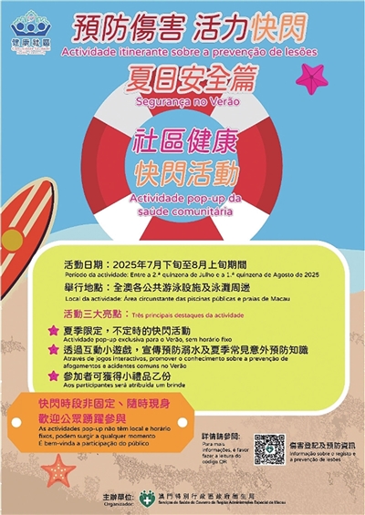 本报讯(记者 大林)为积极推动“健康小区”计划,提升居民对预防溺水及夏季常见意外伤害的防范意识,普及小区的伤害预防知识,卫生局将于7月下旬至8月上旬期间,在全澳各公共游泳设施及泳滩举办“预防伤害,活力快闪”夏日安全小区健康快闪活动,透过轻松有趣的互动游戏,向公众宣传预防溺水、热伤害及其他夏季高发意外的预防措施,欢迎公众踊跃参与。