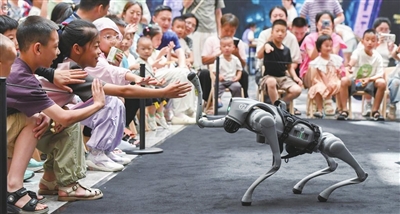 7月6日,浙江省金华市金华之光文化广场科技馆内,小朋友与智能机器狗互动。新华社发(时宽兵 摄)