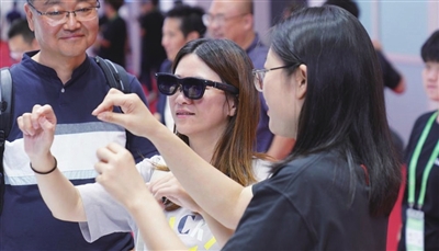 7月16日,在第三届中国国际供应链促进博览会上,参观者体验一款智能眼镜。新华社记者 戴明轩 摄