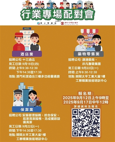 9月18日全日酒店业专场配对会在澳门利澳酒店三楼多功能会议厅举行; 9月22日上午药物零售业专场配对会及同日下午保洁业专场配对会在澳门工联职业技能培训中心(关闸马路101-105A号太平工业大厦第一期1楼)举行。报名日期为9月12日上午9时至9月17日中午12时。
