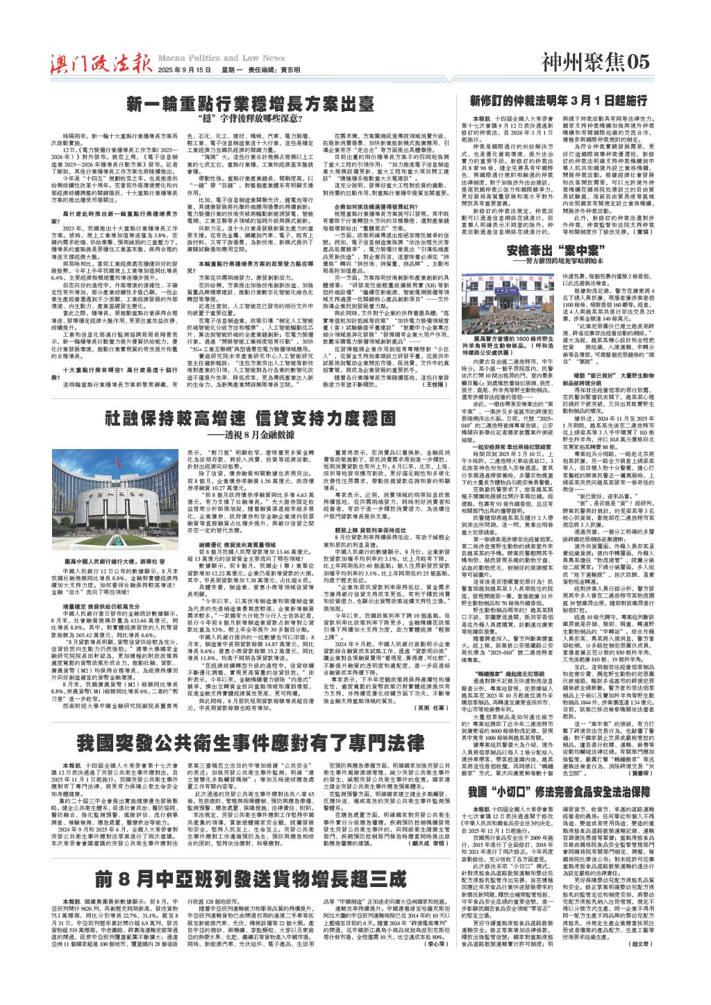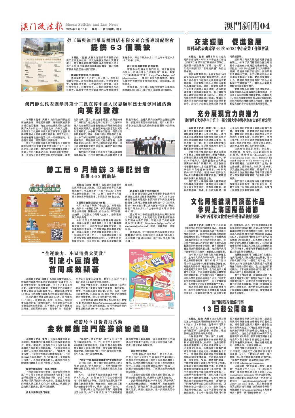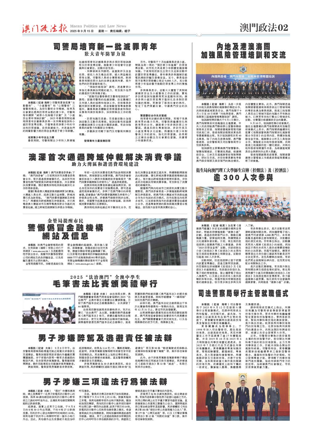 01 一版要闻 02 澳门政法 03 澳门文旅 04 澳门新闻 05 神州聚焦 06 国际热点 07 生活与法 08 深度观察