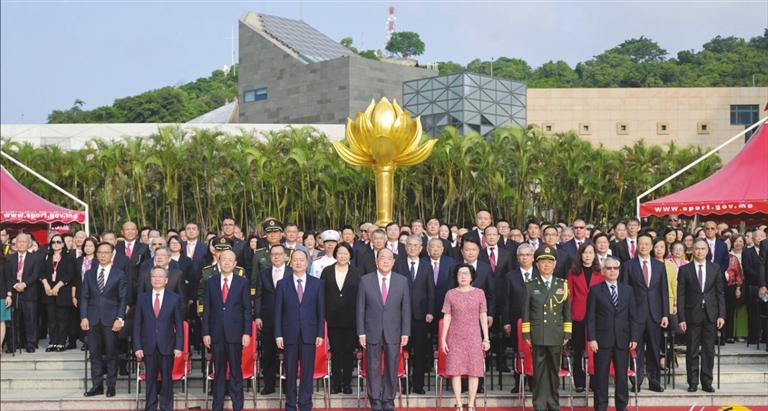 本报讯(记者 海轩)为庆祝中华人民共和国成立74周年,特区政府1日上午8时在金莲花广场举行升旗仪式。行政长官贺一诚偕夫人郑素贞,中联办主任郑新聪、外交部驻澳特派员公署特派员刘显法、驻澳门部队少将司令员于长江、立法会主席高开贤、终审法院院长岑浩辉,特区主要官员,以及全国人大代表、全国政协代表、立法会议员、行政会委员、社团代表等嘉宾出席。