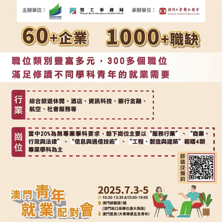 本报讯(记者 桂英)为全方位支持青年学业、就业、事业发展;特区政府透过跨部门协作,全面协助本地居民优先就业,由教育及青年发展局(下称教青局)和劳工事务局(下称劳工局)主办,并由澳门工会联合总会承办的“澳门青年就业配对会”及“澳门青年职前辅导会”于7月3日至5日一连三日在澳门综艺馆举行,为本澳企业与求职青年搭建选配平台,全方位助力青年装备自己投入职场。